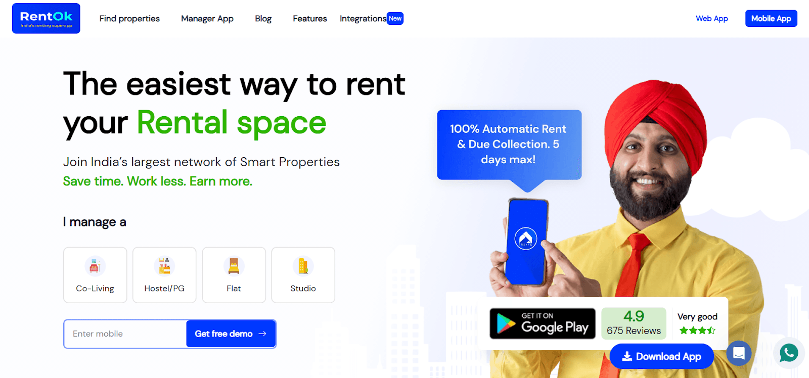 Crib caters to a wide range of property managers, including those managing co-living spaces, serviced apartments, student housing, and PGs. It’s designed for landlords looking to manage diverse property types under one platform and is ideal for those scaling their property portfolios.RentOk: